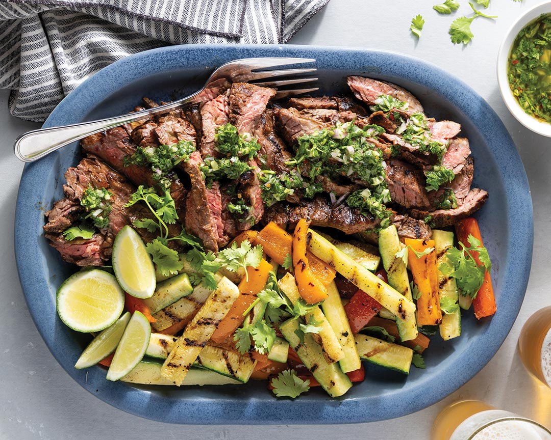 - Grill zucchini and bell peppers until tender, 4 to 5 minutes. Serve with steak and Chimichurri Sauce. Garnish with limes and cilantro, if desired.