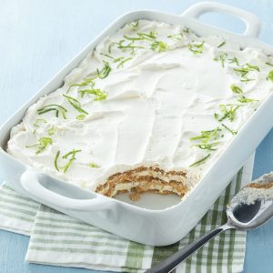 2. This kind of reminds me of an icebox cake my grandmother made at Christmas time with Graham crackers, applesauce, two different flavors of Jello (she used red and green) and whipped cream to cover the layers. I remember it being pretty sweet but I loved it. I think I was the only one. The different colored layers fascinated me. I haven’t made one since I was little. This one looks better though and not as sweet. I love key lime pie.