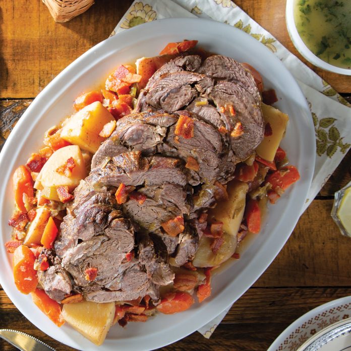 - Cover and cook on high heat until fork tender, about 5 to 6 hours. Add potatoes in the last 2 hours of cooking and sprinkle with remaining ½ teaspoon salt and remaining ½ teaspoon ground black pepper. Sprinkle with bacon, and serve with Lemon-Mint Dressing.
